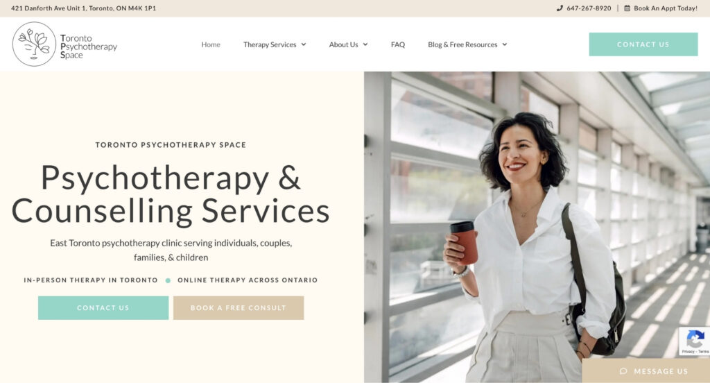 This is where a lot of practices drop the ball. Toronto Psychotherapy Space has individual pages for depression therapy, trauma and PTSD therapy, parenting support, and more. Each page is optimized for the exact search terms people are typing into Google (“depression therapy Toronto,” “PTSD counselling near me”). This makes them rankable for dozens of different search queries instead of just one generic “therapy in Toronto” page. It also means they can run highly targeted Google Ads that send people to the exact service they’re searching for. That’s how you grow a counselling practice through your website. This is essential therapy website design strategy for SEO.